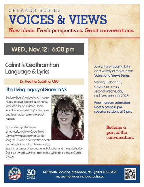 Cainnt is Ceathramhan | Language & Lyrics: The Living Legacy of Gaelic in Nova Scotia, with Dr. Heather Sparling, ethnomusicologist at Cape Breton University.