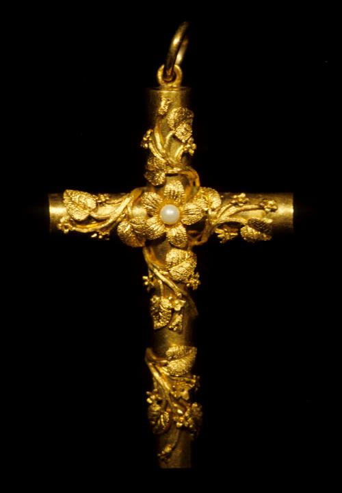 Cross pendant made by Julius Cornelius. Gold mayflower motif, with pearls from Oyster Pond, NS. NSM History Collection: 60.20.4c